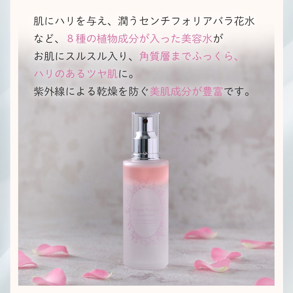 肌にハリを与え、潤うセンチフォリアバラ花水はじめ、8種の植物成分が入った美容水。お肌にスルスル入り、角質層までふっくら、ハリのあるツヤ肌に。