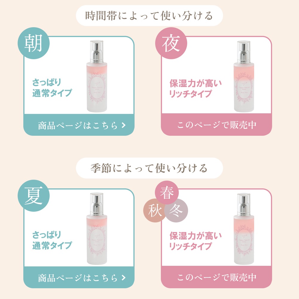 (選択) ![]() ミスト化粧水 さっぱりしたい方に おすすめ ![]() 保湿ローション より保湿したい方に おすすめ |