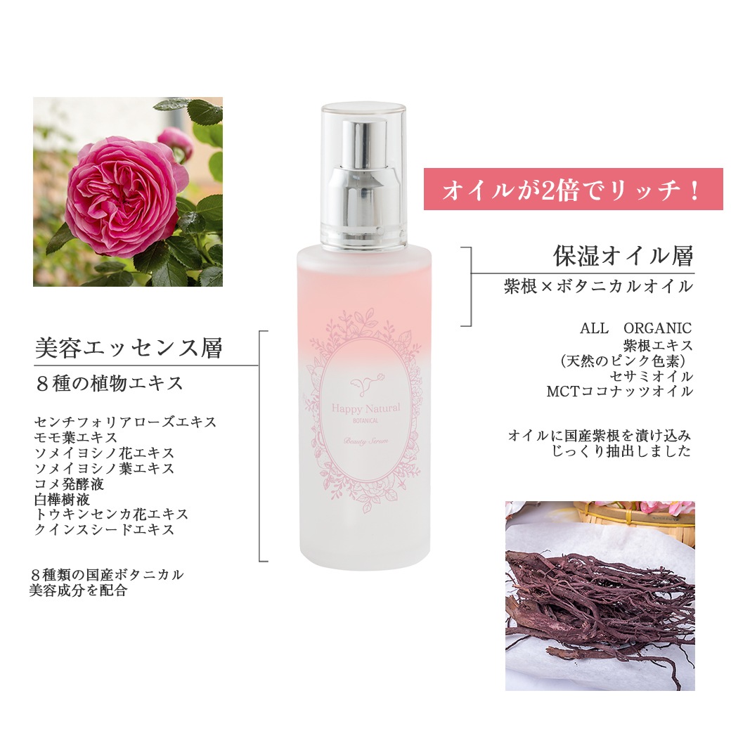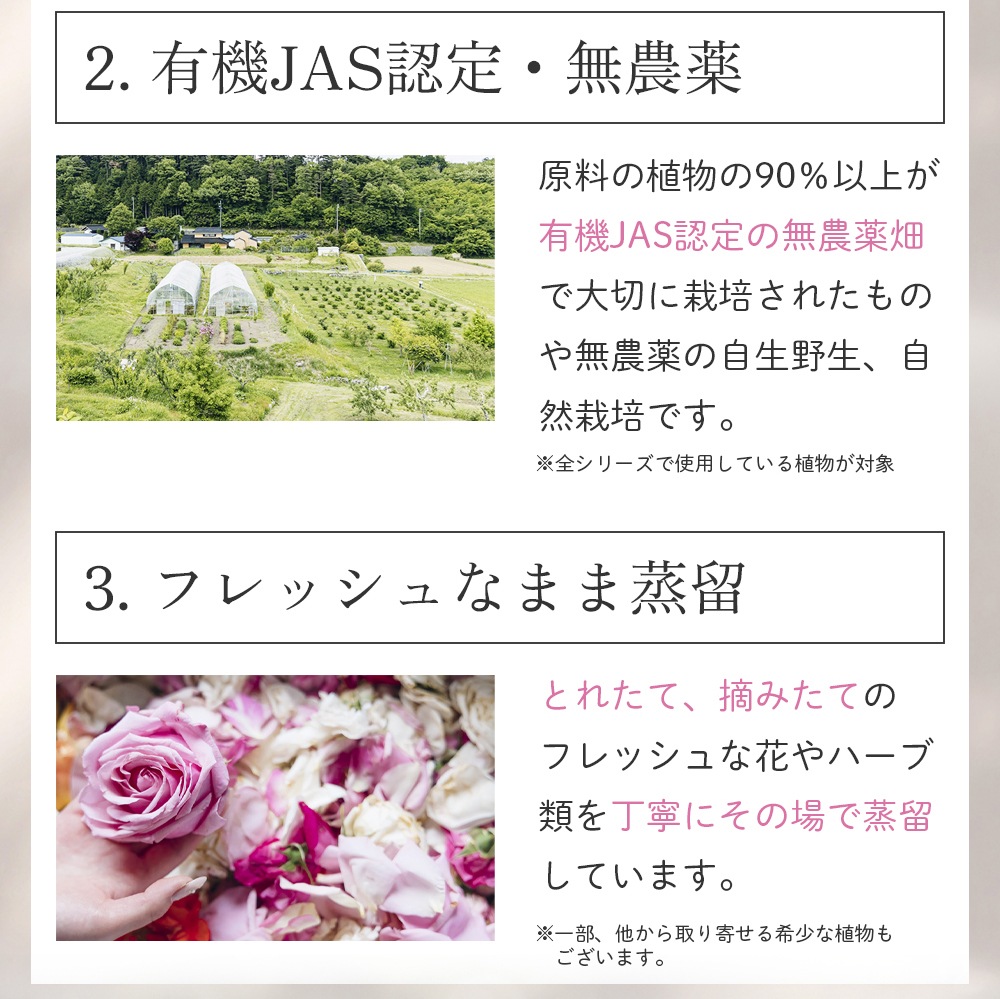美容液層にはバラの蒸留水をはじめ、8種類以上の有機JAS植物成分配合。