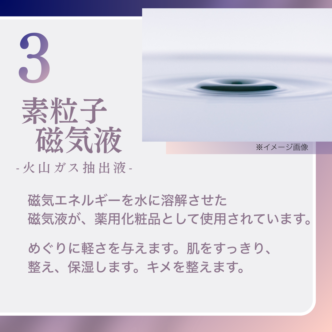 磁気エネルギーを水に溶解させた特殊な磁気液が有効成分を活性化。軽さを与えます。めぐりを広げスムーズにし、入れ替わりにアプローチ。