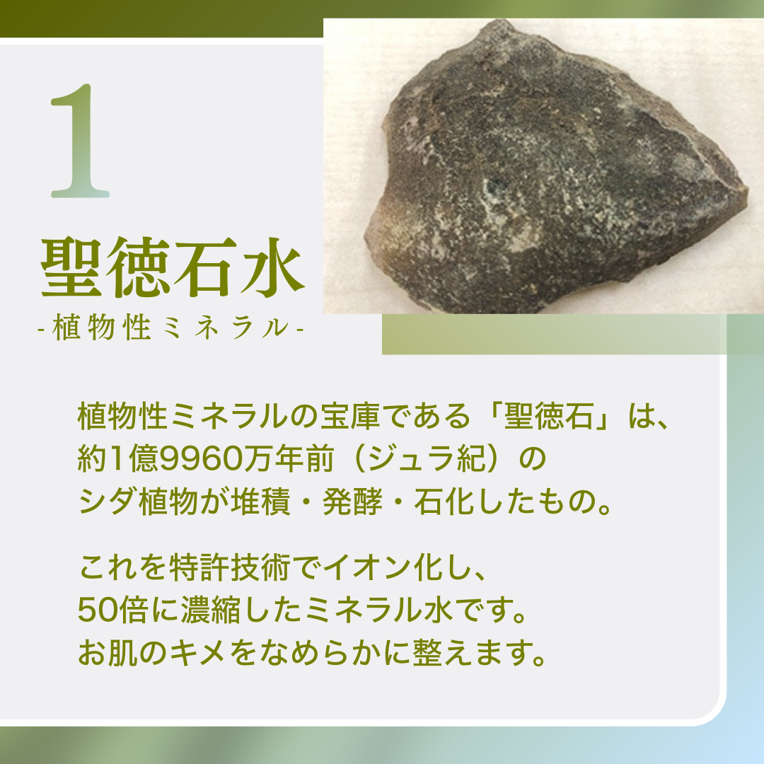 植物性ミネラルの宝庫である「聖徳石」は、約1億9960万年前(ジュラ紀)のシダ植物が堆積・発酵・石化したもの。これを特許技術でイオン化し、50倍に濃縮したミネラル水です。 お肌表面を引き締めてなめらかに整えます。