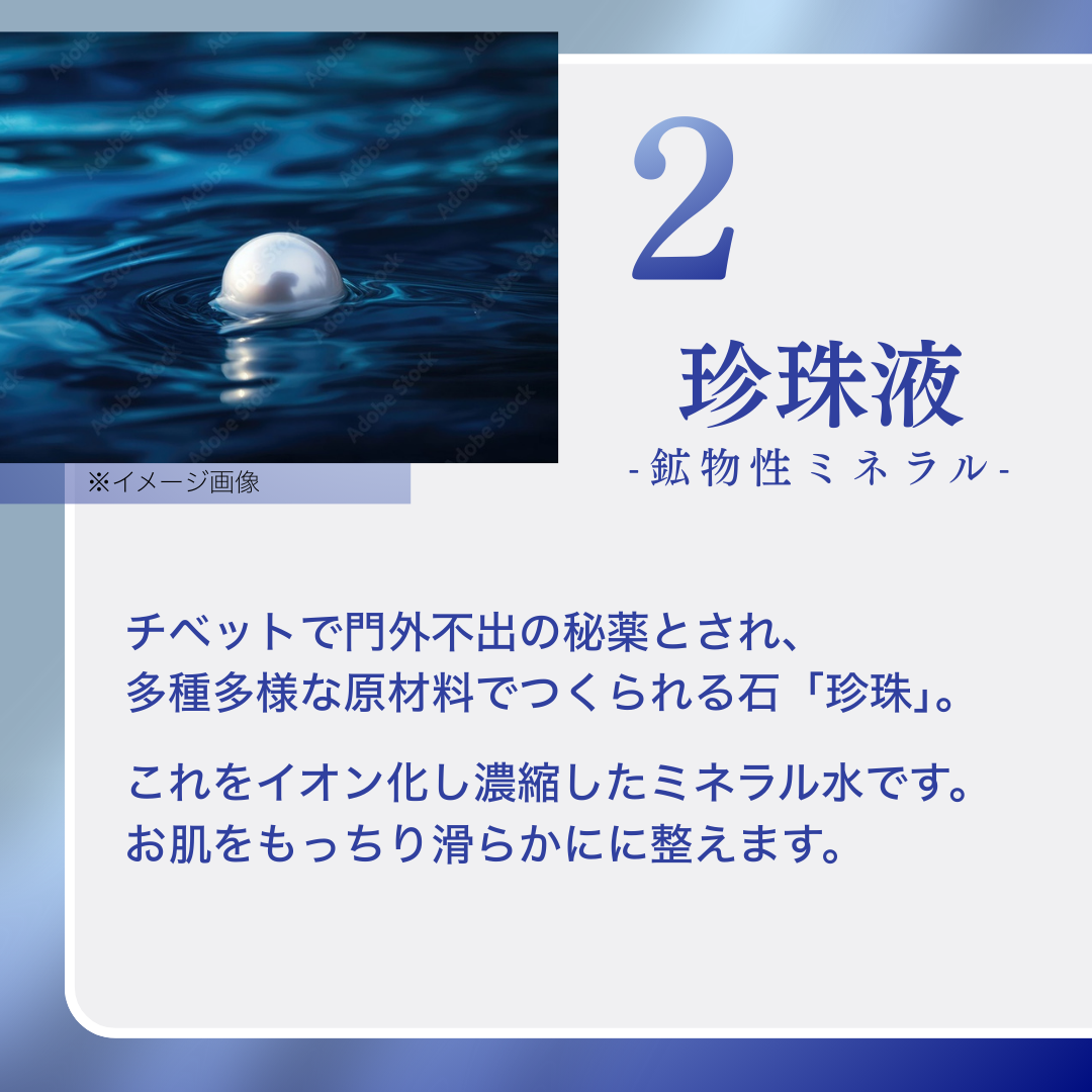 チベットで門外不出の秘とされ、多種多様な原材料でつくられる石「珍珠」。これをイオン化し濃縮したミネラル水です。お肌をもっちりしっとりプリプリに整えて栄養を与えます。