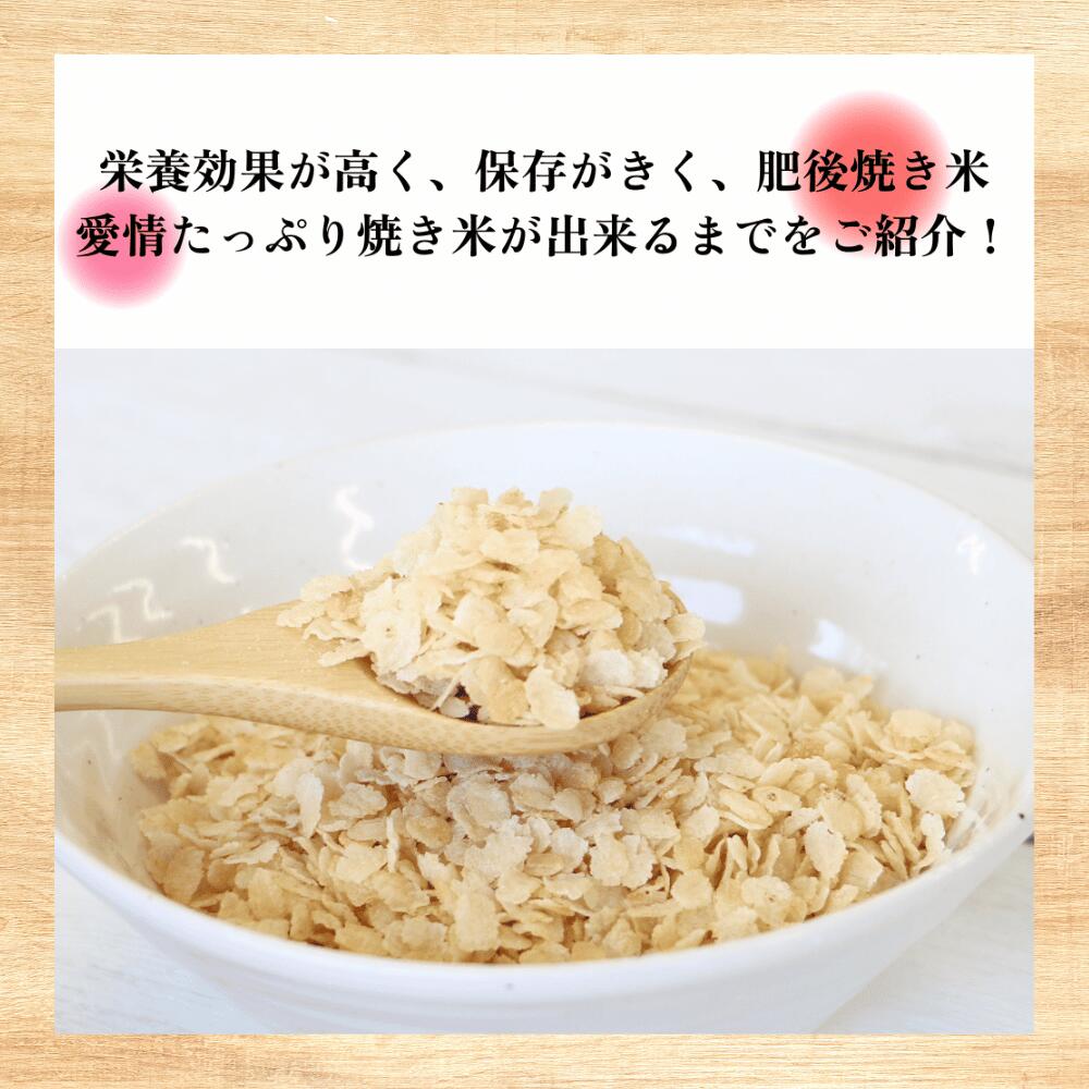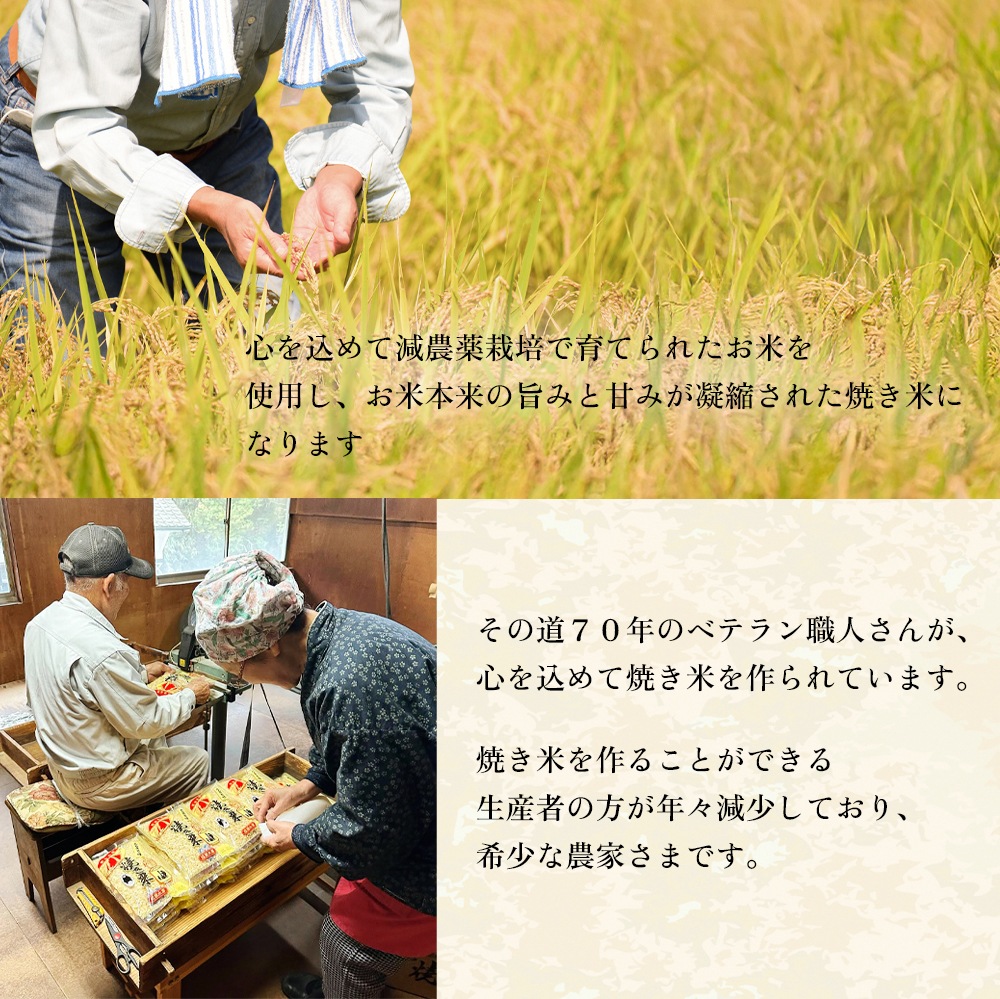 心を込めて、減農薬栽培で育てられたお米を使用し、 サクサクと食べられ、お米本来の旨みと甘みが凝縮された焼き米になります。