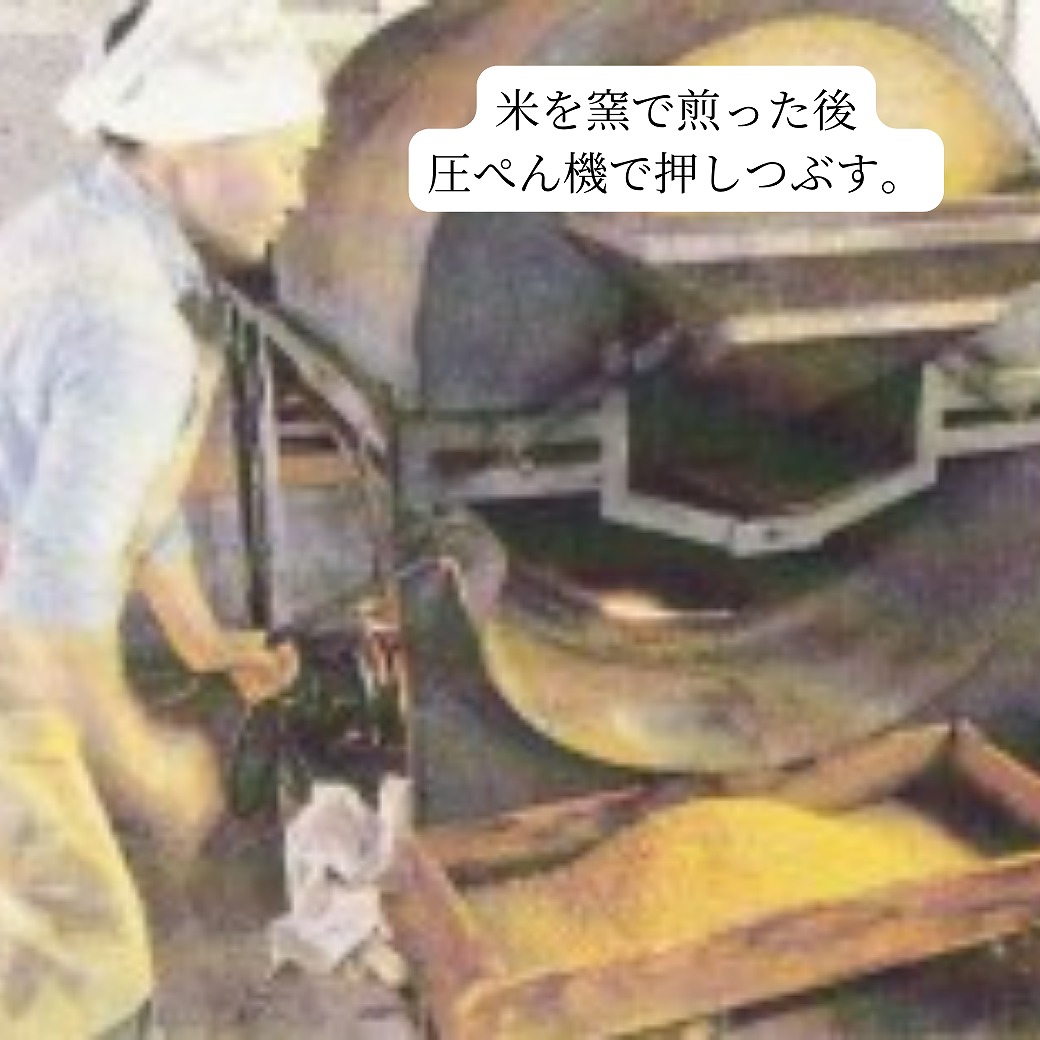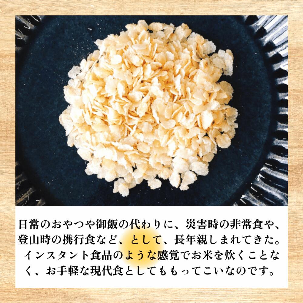 米を釜で炒り、平らにつぶした保存食。お米がもつビタミンなどまるごと口にすることができる栄養保存食です
