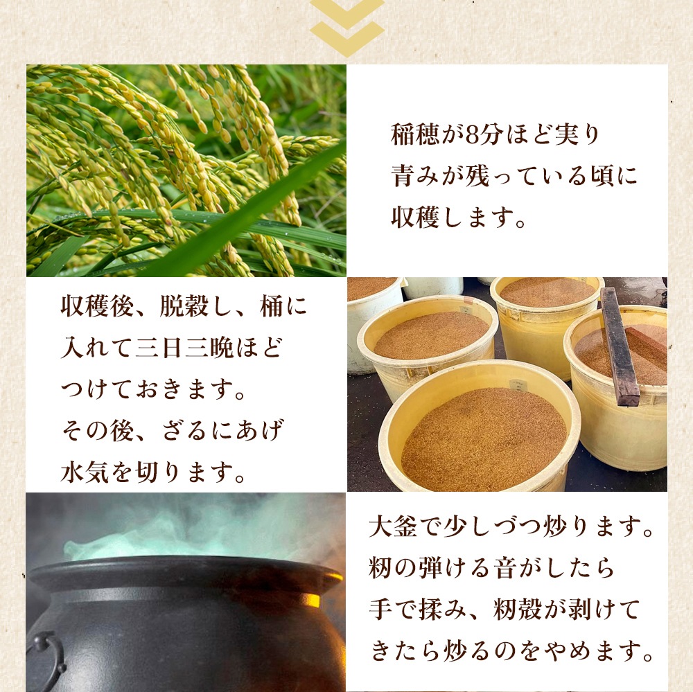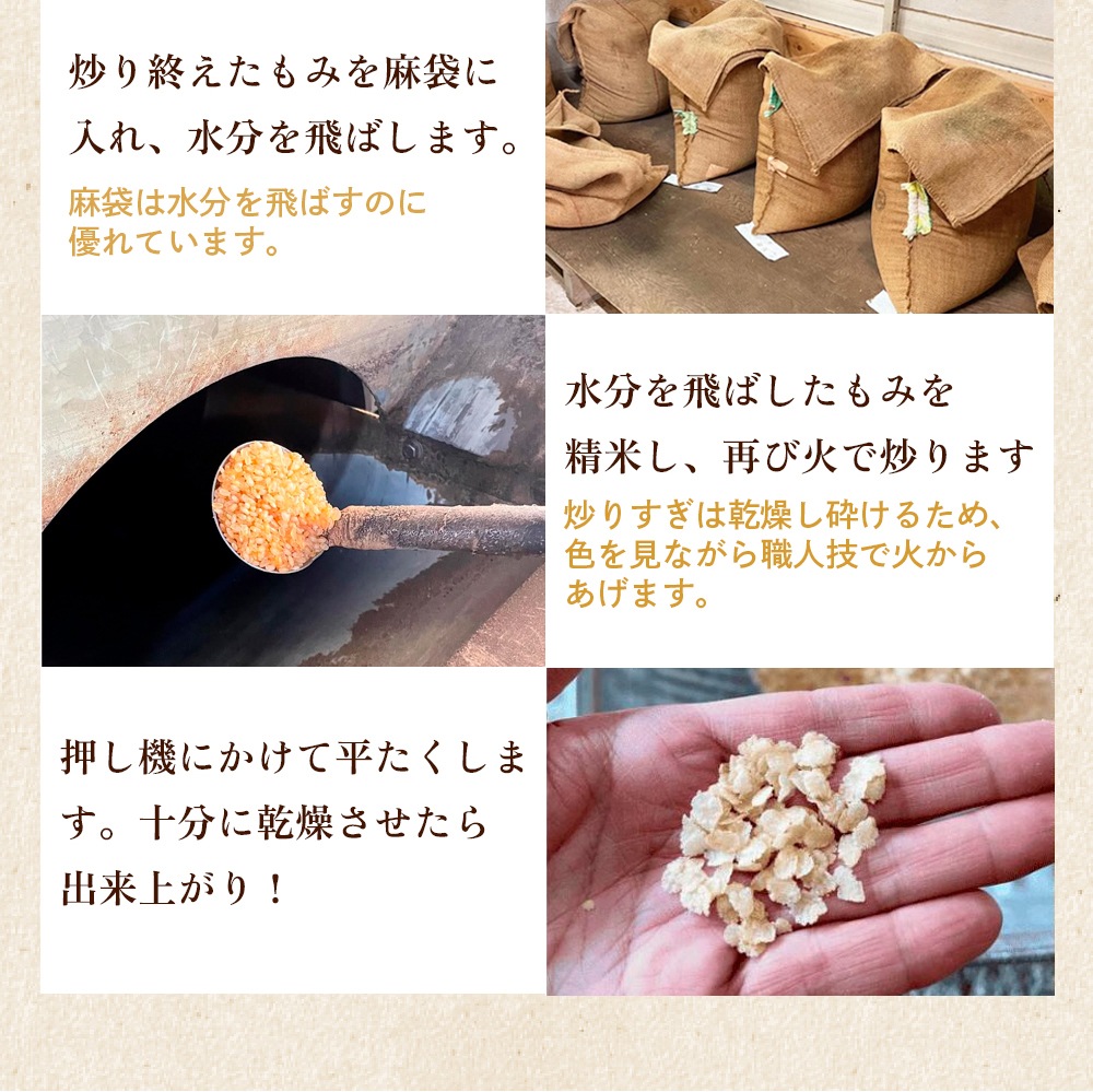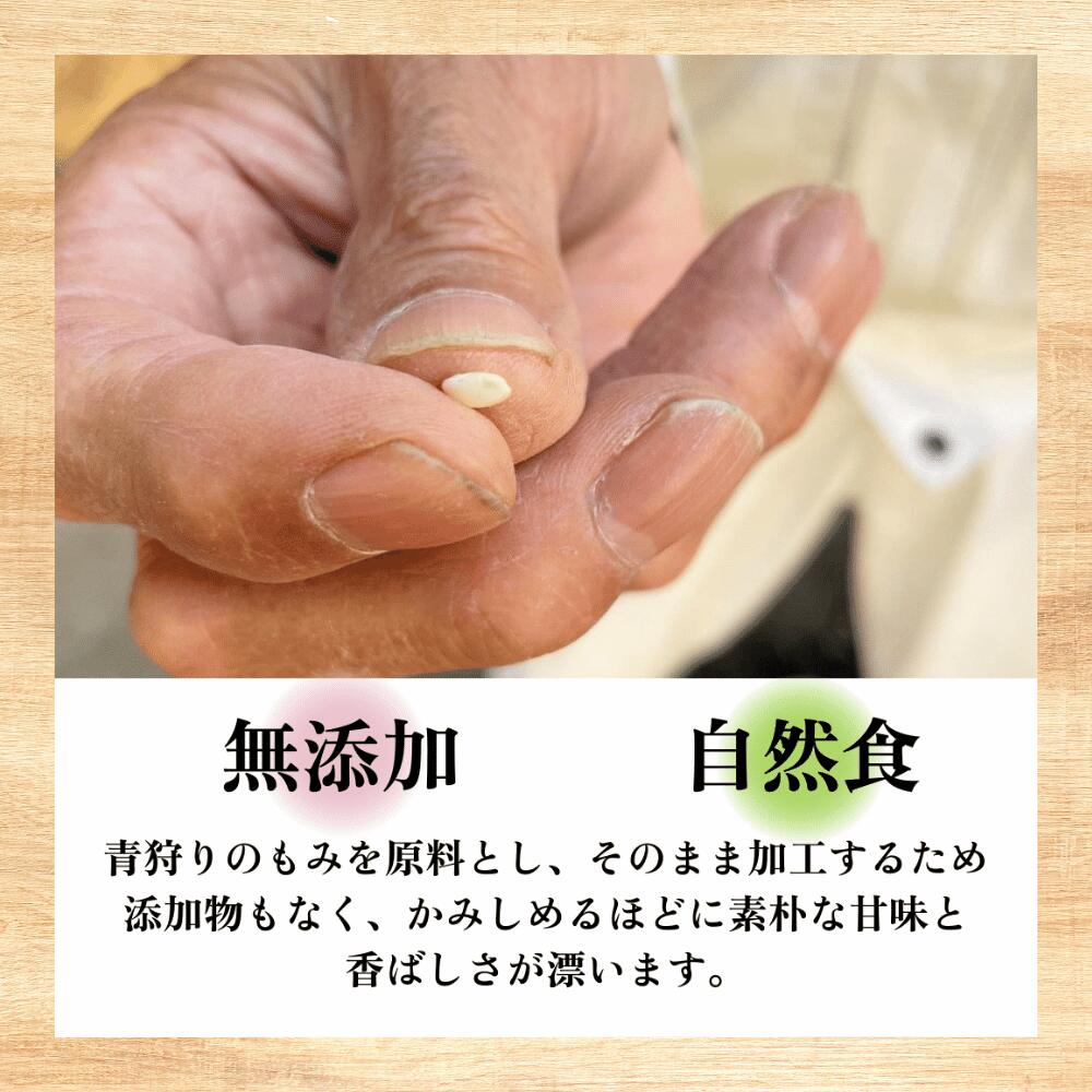 青狩りのもみを原料とし、そのまま加工しますのでなんの添加物もなく、かみしめるほどに素朴な甘味と香ばしさが漂います。郷土自慢の伝統食品として安心していただけます。