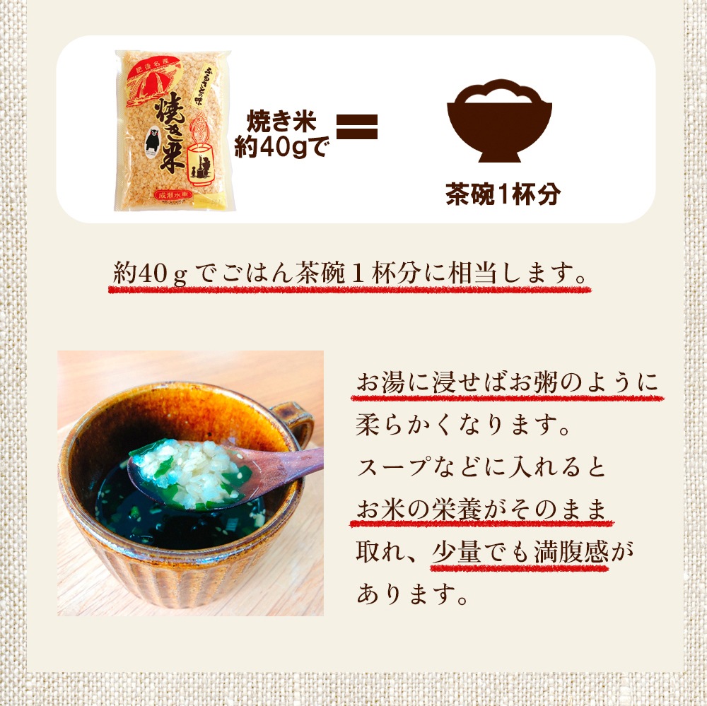 - ●コップ2分の1ぐらい焼き米を入れ、熱いお茶を注ぎ、 1~2分し、塩を加えて召しあがっり下さい。