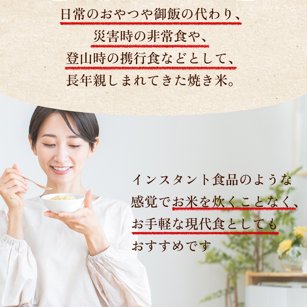 日常のおやつや御飯の代わりに、災害時の非常食や、登山時の携行食など、として、長年親しまれてきた。インスタント食品のような感覚でお米を炊くことなく、お手軽な現代食としてももってこい。
